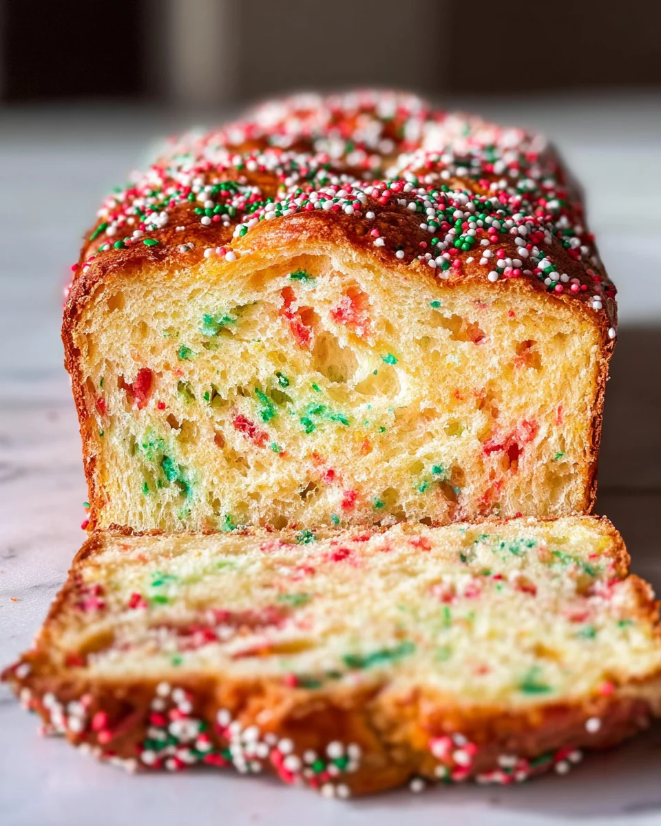 Tender, moist buttermilk bread studded with vibrant Christmas sprinkles, perfect for brightening any holiday breakfast, brunch, or tea. This festive treat combines classic flavor with playful holiday whimsy.