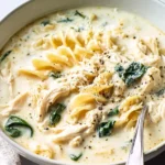 Let me introduce you to a cozy bowl of comfort that’s bound to become a favorite in your home: Chicken Alfredo Soup. This delightful dish combines the creamy richness of traditional Alfredo sauce with tender chicken and wholesome vegetables, all nestled in a warm, soothing broth. What makes this recipe truly special is its ability to bring the beloved flavors of classic Chicken Alfredo into a hearty soup that’s perfect for any occasion.