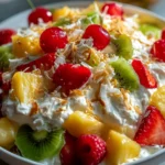 The whipped topping adds that lightness and airy texture that balances the dense cream cheese. Opt for a non-dairy whipped topping if you’re looking for a dairy-free variation. Meanwhile, the combination of fresh fruits—strawberries, pineapple, kiwi, and raspberries—adds vibrant colors, sweetness, and a refreshing tartness. Be sure to use ripe, fresh fruits for the best flavor, and you can easily swap in other fruits like mango or blueberries based on what’s in season.