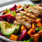 What makes this recipe so special, you ask? Well, it’s the magical combination of perfectly roasted beets and sweet potatoes – their natural sweetness intensified by the heat – paired with the luxurious creaminess of ripe avocado. Add to that tender, savory grilled chicken, and you’ve got a powerhouse of a meal that hits all the right notes. Every forkful is a delightful contrast of textures and flavors: earthy, sweet, creamy, and wonderfully savory.