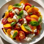 This salad is more than just a dish; it’s a symphony of flavors and textures. The sweetness of perfectly ripe peaches dances with the acidity of fresh tomatoes, while the burrata adds a luxurious creaminess that ties everything together. Drizzled with a touch of balsamic glaze and sprinkled with fresh basil, it’s a feast for the eyes and the palate. The colors pop—vivid reds, sunny yellows, and lush greens—making it the centerpiece of any summer gathering.