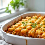 This Cowboy Casserole combines savory ground beef, sweet corn, gooey cheese, and crispy tater tots into one hearty dish. It’s the ultimate comfort food that guarantees smiles around the dinner table!