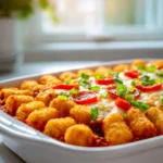 - Top with More Tater Tots & Cheese: Arrange the remaining frozen tater tots in a single layer over the cheese and toppings. Again, don’t stress about perfect placement. Finally, sprinkle the remaining shredded mozzarella cheese evenly over the top layer of tater tots. This top layer will get beautifully golden and crispy.